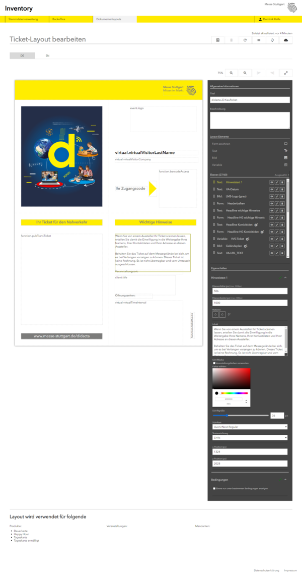 Alles unter Kontrolle. Ein übersichtliches Dashboard ermöglicht den Zugriff auf Stammdaten, die Auswertung von Besucherbefragungen und die Bearbeitung von Reklamationen und Stornierungen. Die Design Tools ermöglichen die CD konforme Gestaltung von Rechnungen, Tickets und Wallets im Look & Feel der Veranstaltung.